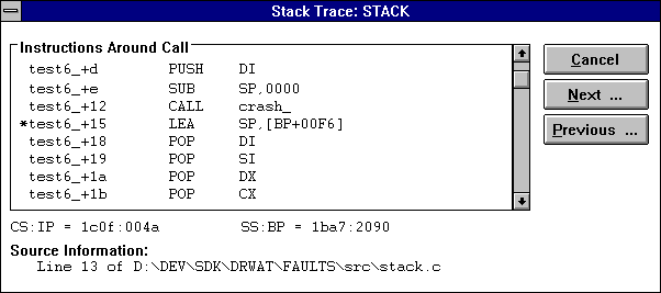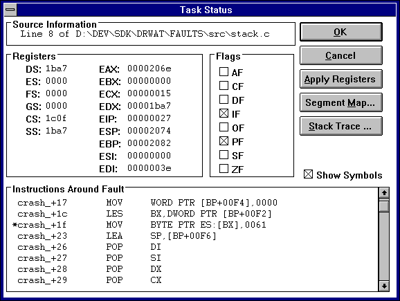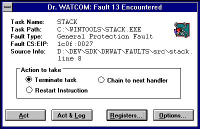 to the faulting process. The Dr. Watcom exception dialog then appears and you can proceed as usual.